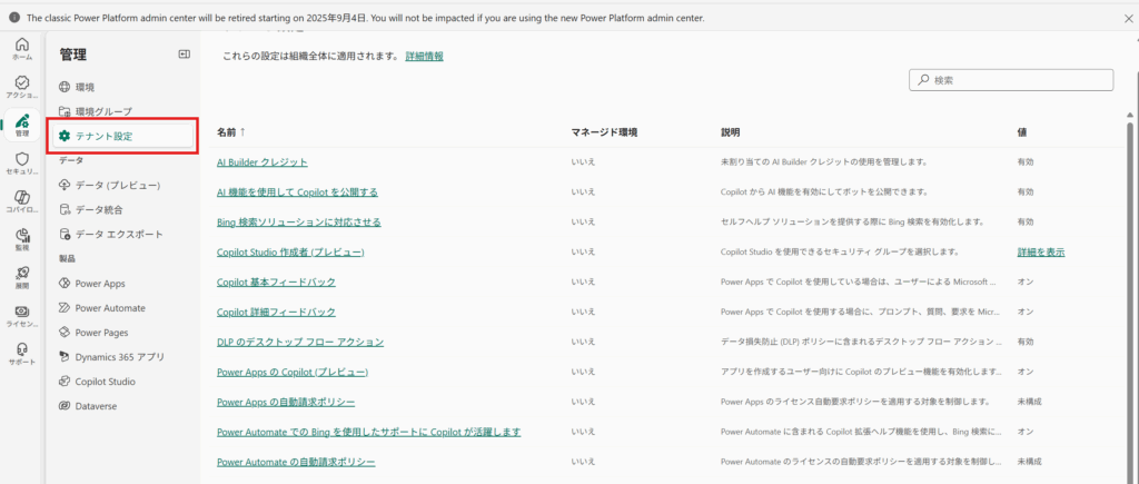管理メニューの左側からテナント設定を選択します。ここで重要なのは、適切な管理者権限を持っていることですね。