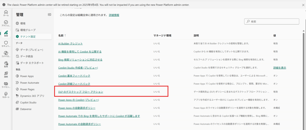 テナント設定の一覧画面では、さまざまな設定項目が並んでいますが、その中から 「DLPのデスクトップフローアクション」 という項目を探して選択します。