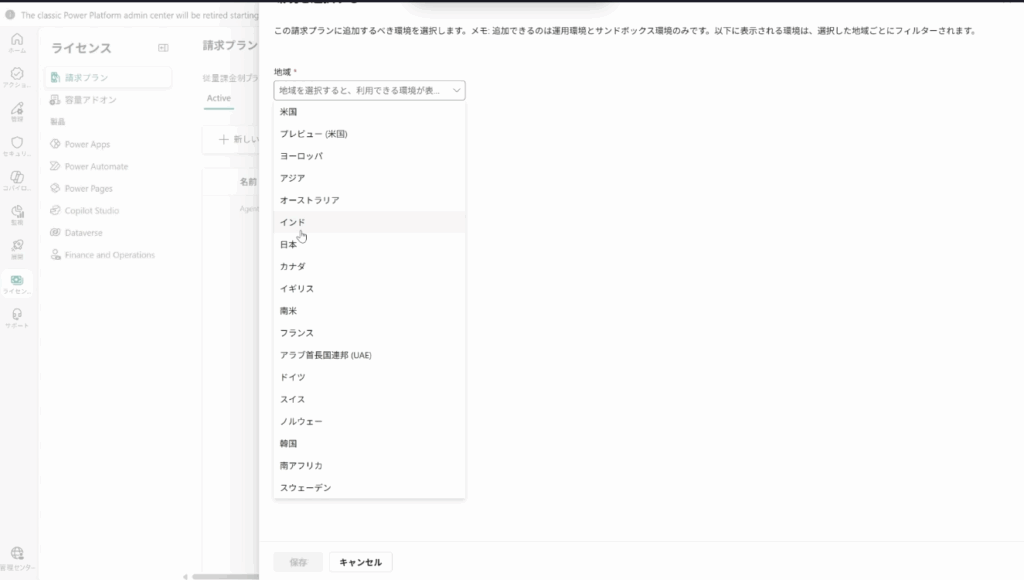 Power Platform製品の項目では、Copilot Studioにチェックを入れます。次に、環境を選択する画面で地域を選択し、保存をします。