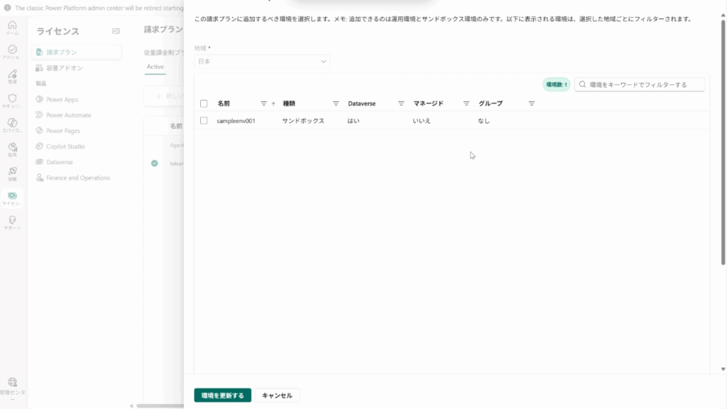 従量課金制は、特定のPower Platform環境に請求プランを割り当てる形で利用します。運用またはサンドボックスタイプの環境に割り当てることが可能です。