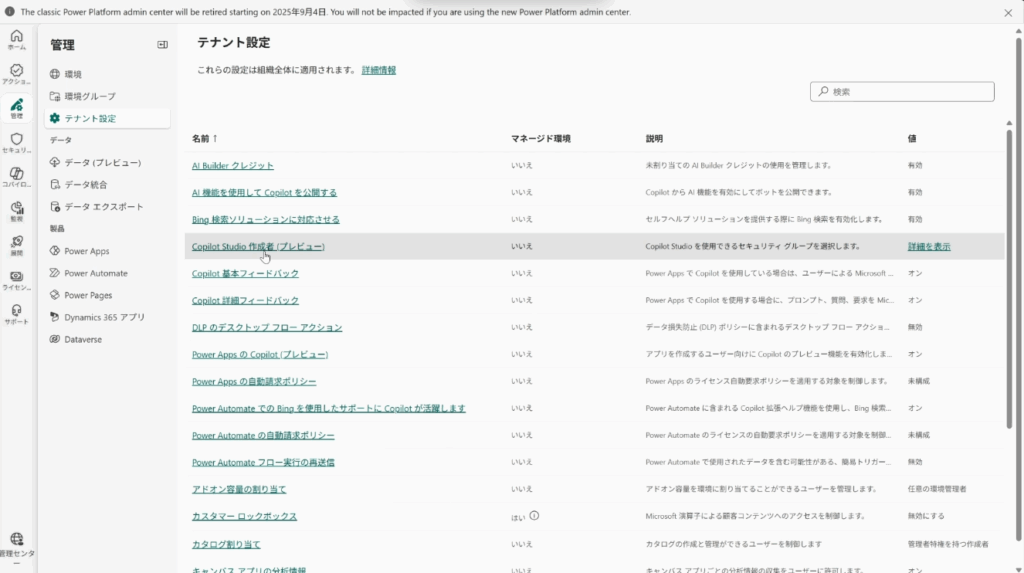 特に従量課金制を利用する場合で、ユーザーライセンスがないような場合は、Power Platform管理センターの管理、テナントの設定、Copilot Studioの作成(プレビュー)から設定することが可能です。