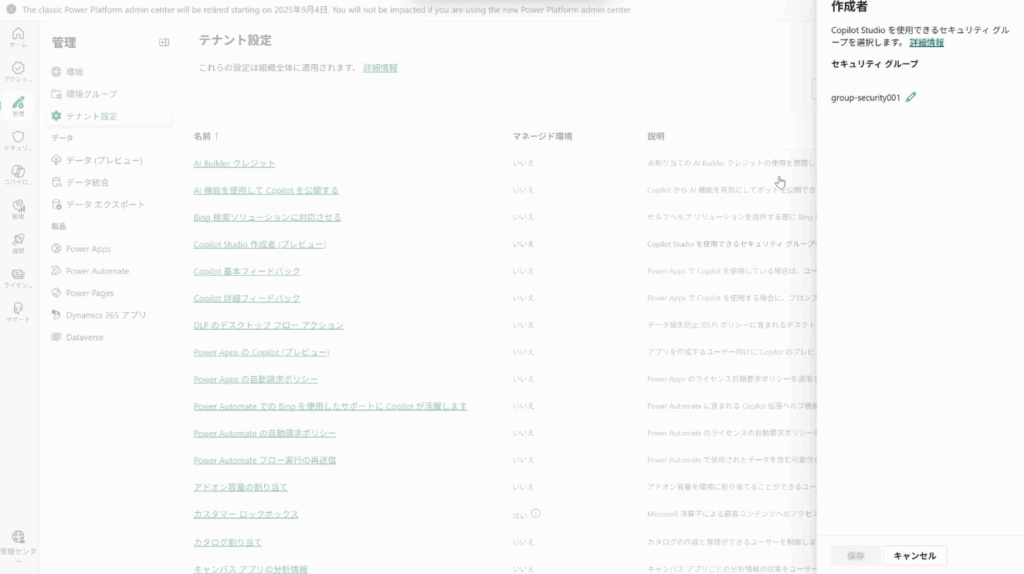 ここでセキュリティグループを選択し、保存を選択することで、そのセキュリティグループに所属するユーザーのみがCopilot Studioでエージェントを作成することが可能になります。
