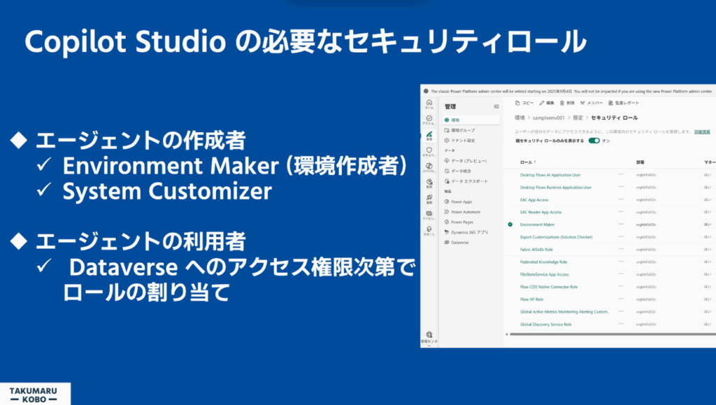 エージェントの利用に必要なロールはシナリオによって異なります。もし、利用者の権限でエージェントを実行する設定をしていたような場合は、利用者に対してDataverse のデータアクセス権限が必要になります。