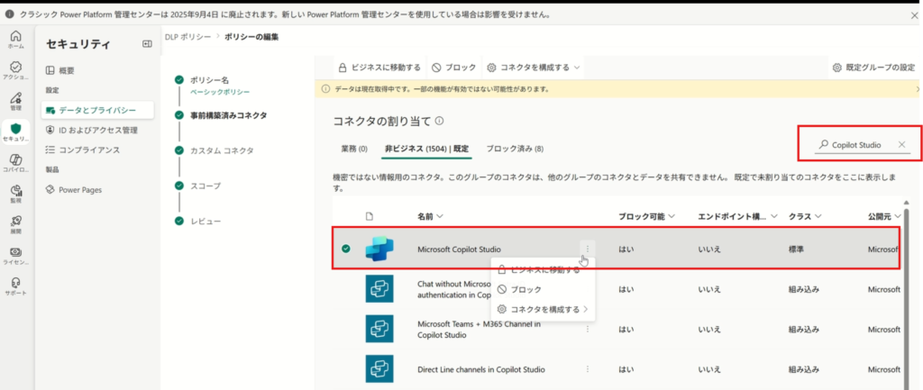 Copilot Studio」と検索します。 - コネクタをブロック 一番上に表示されている「