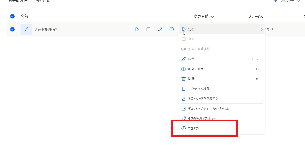 ショートカットキーを使用するためには、まずは対象のフローのプロパティを指定する必要があります。