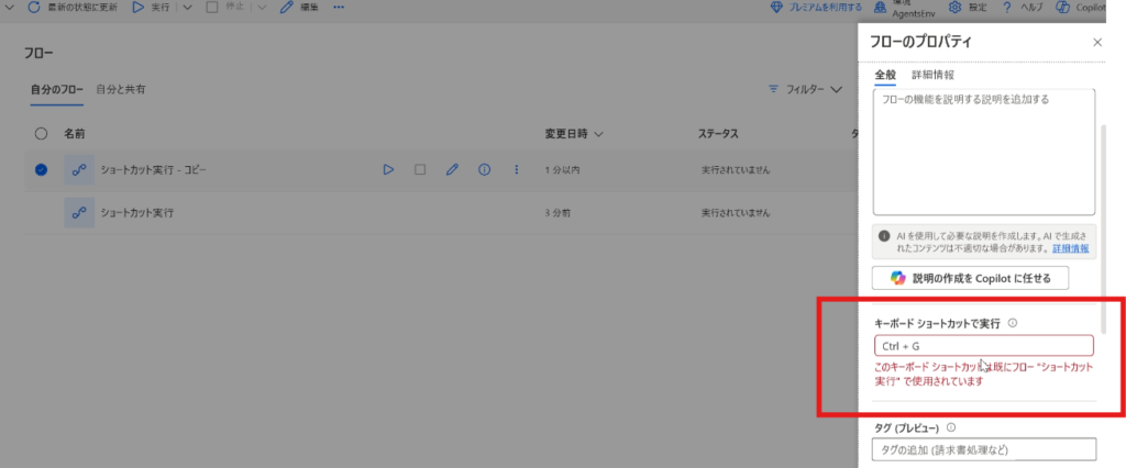 また、すでに設定したショートカットキーを別のフローに設定しようとすると、このようにエラーが表示される点にも注意が必要です。