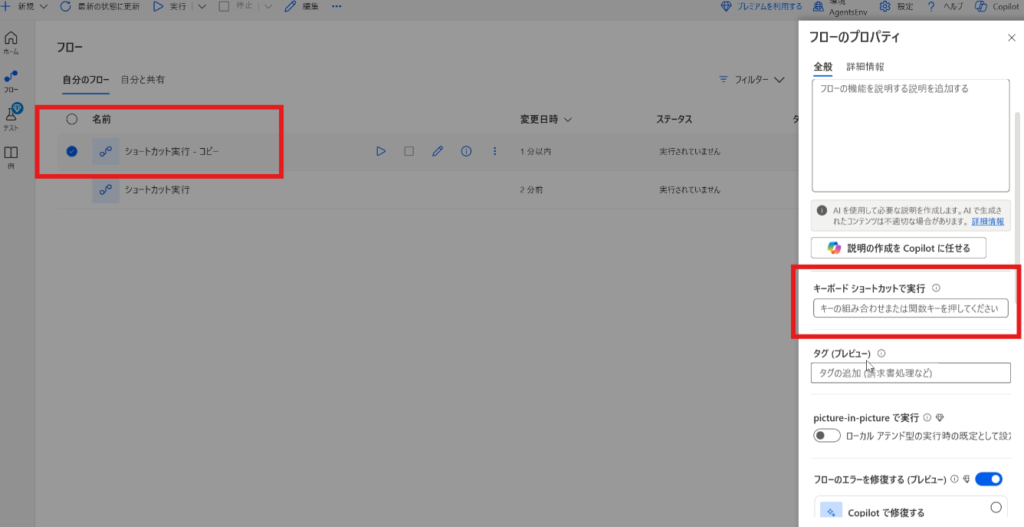 つまり、コピーしたフローでショートカットキーを使いたい場合は、改めて設定し直す必要があるということですね。