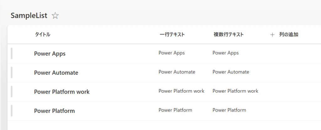 今回利用しているリストは以下のリストです。(今回はタイトル列以外は利用しません)