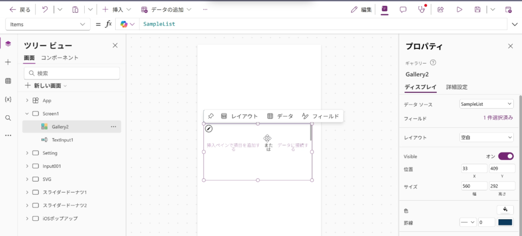 続いて、検索結果を表示するための空の垂直ギャラリーコントロールを追加しましょう。このギャラリーが、入力に応じて候補を表示してくれる部分になります。