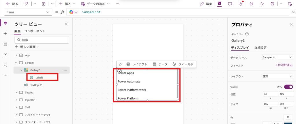 ギャラリーコントロールのItemsプロパティに、検索用のデータソースであるSharePointリストを設定します。