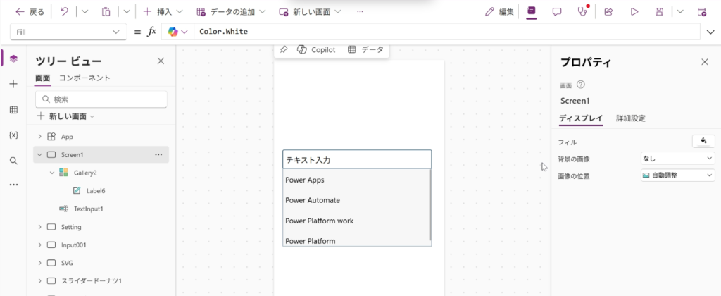 次に、テキスト入力コントロールの値に応じて検索できるように、ギャラリーのItemsプロパティを修正します。