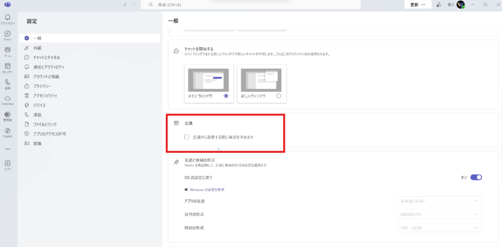一般メニューの中にある退室確認に関する設定項目を見つけましょう。こちらの設定にチェックをつけるだけで設定は完了です。