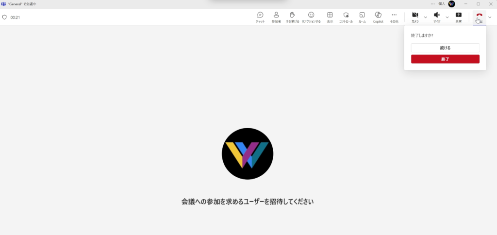 もう一度会議を実施して、退室ボタンを押してみます。すると、最初と異なり、確認ダイアログが表示される形になります。