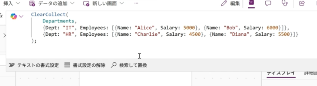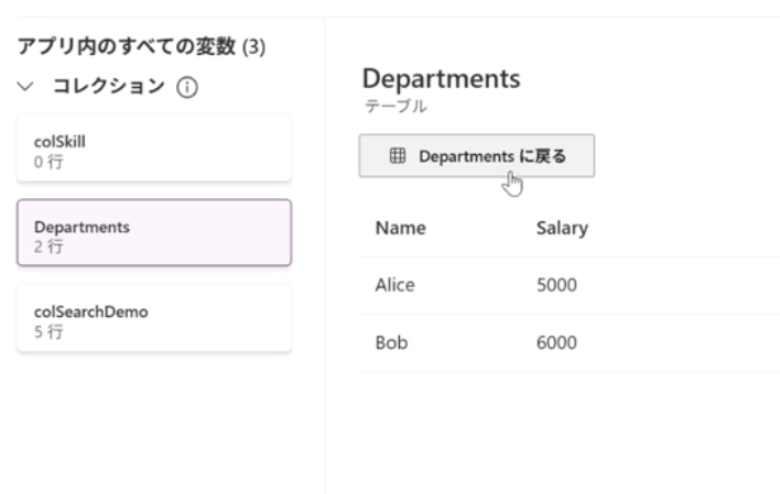 一見普通のテーブルに見えますが、よく見るとEmployees列の中身がテーブル型になっていて、階層化したコレクションになっているんですね。