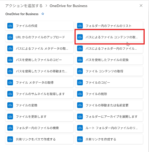 まずは、埋め込みたい画像のコンテンツを取得する必要があります。ここではOneDriveコネクターを利用します。