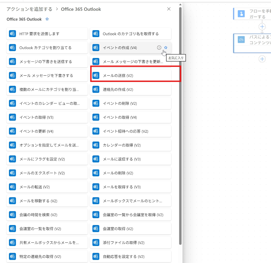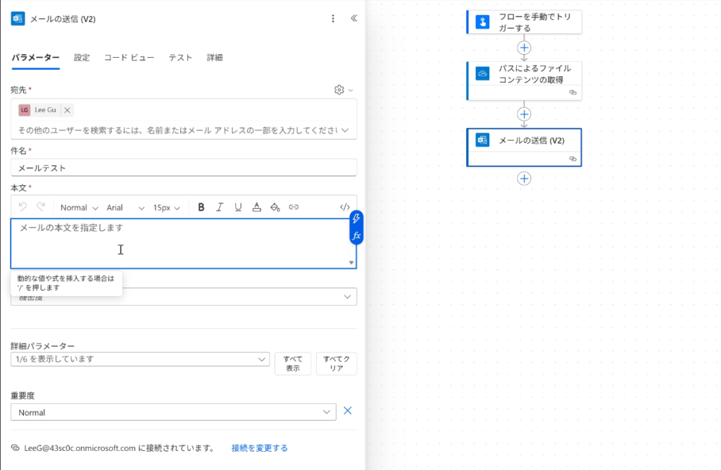 Outlookコネクターのメールの送信V2アクションを追加しましょう。宛先と件名は、用途に合わせて適当に設定してください。