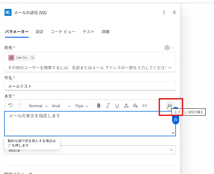 ここで重要なのは、メールの本文をHTML形式で入力するという点です。まず、コードビュー形式に設定を変更します。