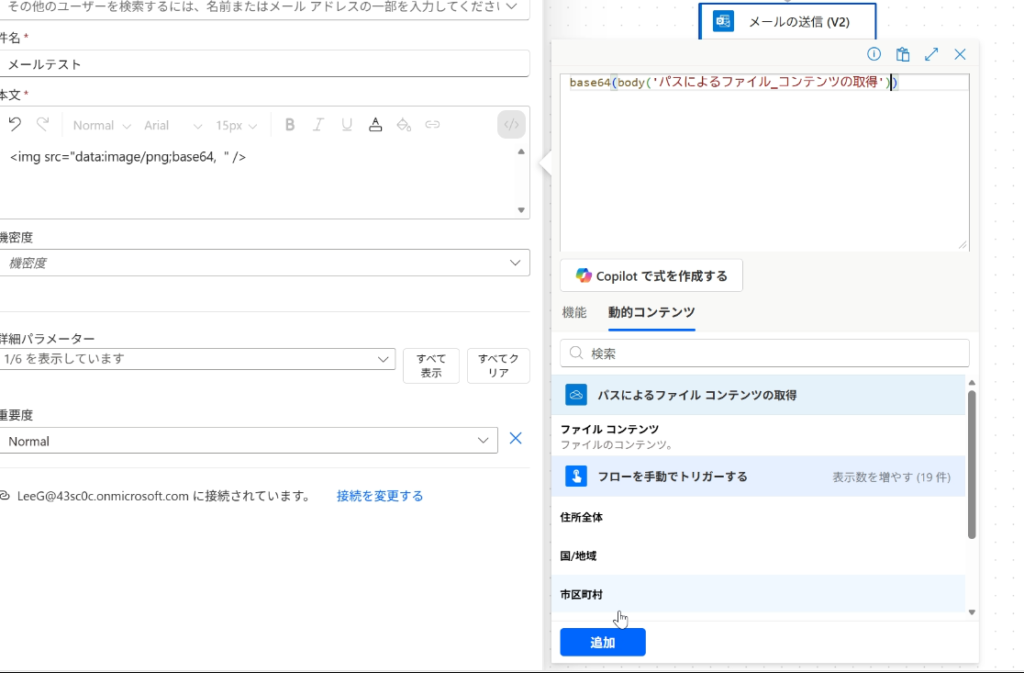 画像のコンテンツを取得できるアクションはいくつかありますが、今回はパスによるファイルコンテンツの取得を使ってみましょう。ファイルパスには、埋め込みたい画像のパスを指定します。