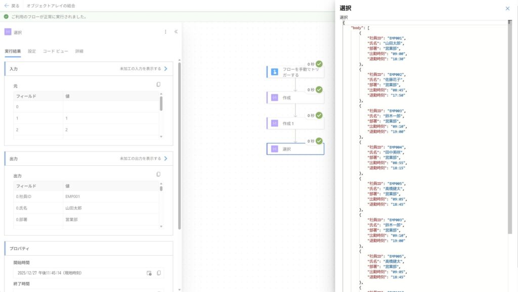 この方法を使えば、Apply to eachを使わずに効率的に配列を結合できます。大量のデータを扱う場合でも、パフォーマンスが良いのでおすすめです。
