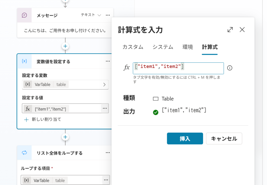 この部分はPower Fx、つまりPower Appsと同じような式を書くことができるので、今回の例以外にもいろんな値を持ったテーブルを作ることが可能です。