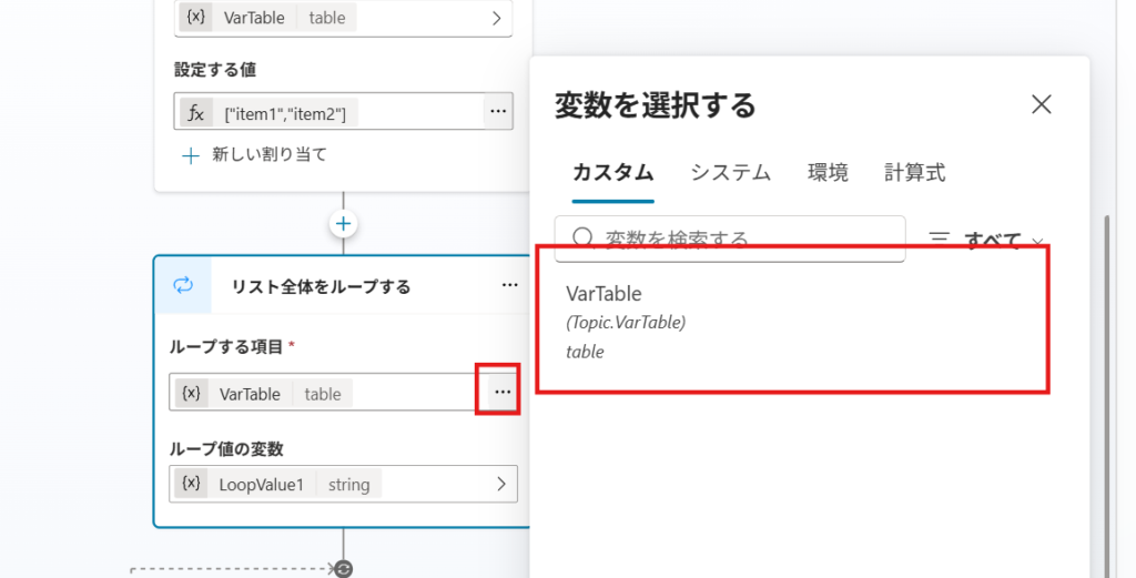 変数の管理からリストの管理を開くと、繰り返し処理をするための「リスト全体をループする」ノードが見つかります。このノードのループする項目に対して、先ほど作成したvarTableを設定しましょう。