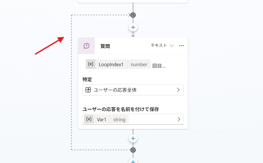 繰り返し処理を追加すると、その下に点線が表示されます。この点線の中に配置した処理を、エージェントが繰り返し実行するようになります。