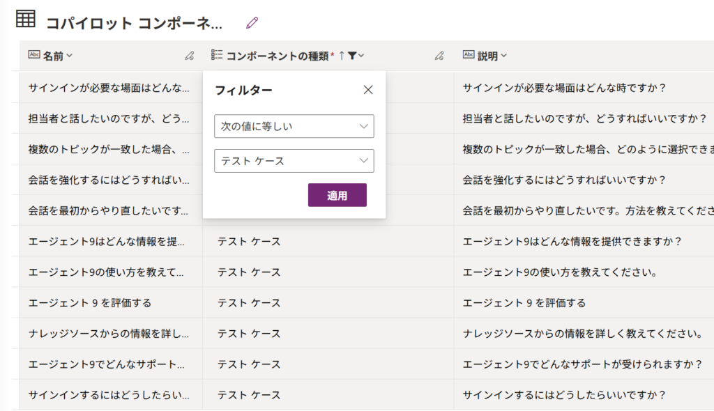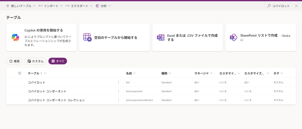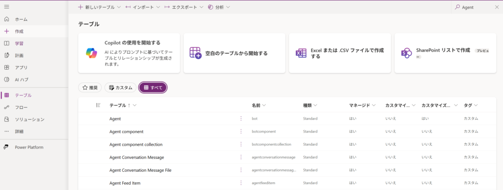 実際にデータを確認しに行くと、環境によって少し状況が異なる場合があります。コパイロットコンポーネントテーブルが存在しない環境では、代わりに Agent components が用意されているので、そちらを確認してみてください。