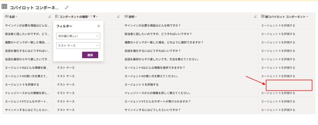 テーブルを開いたら、コンポーネントの種類のフィルターをテストケースに変更してみましょう。