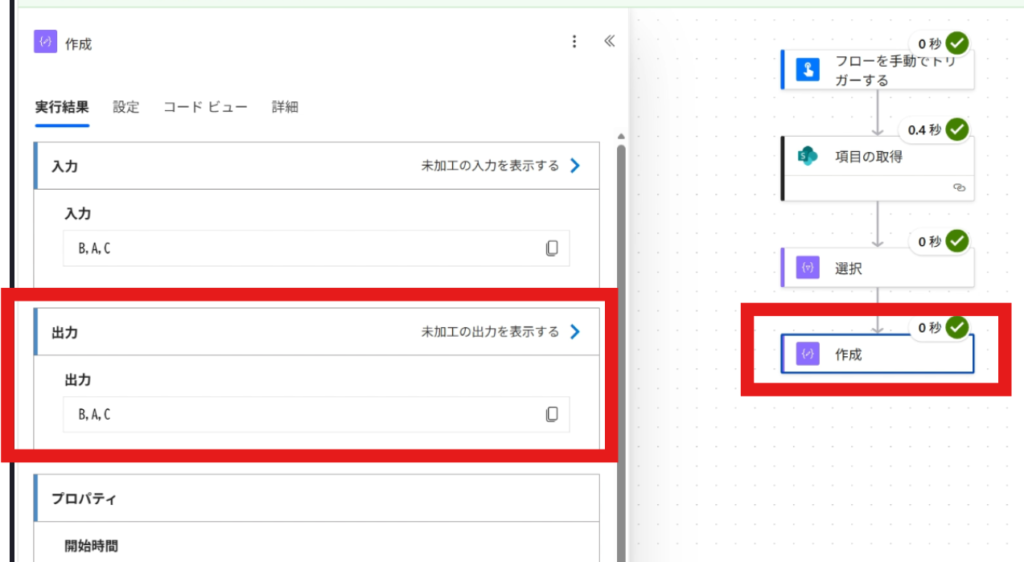 事前準備ができたら、作成アクションを追加して、いよいよカンマ区切りの文字列に変換してみましょう。