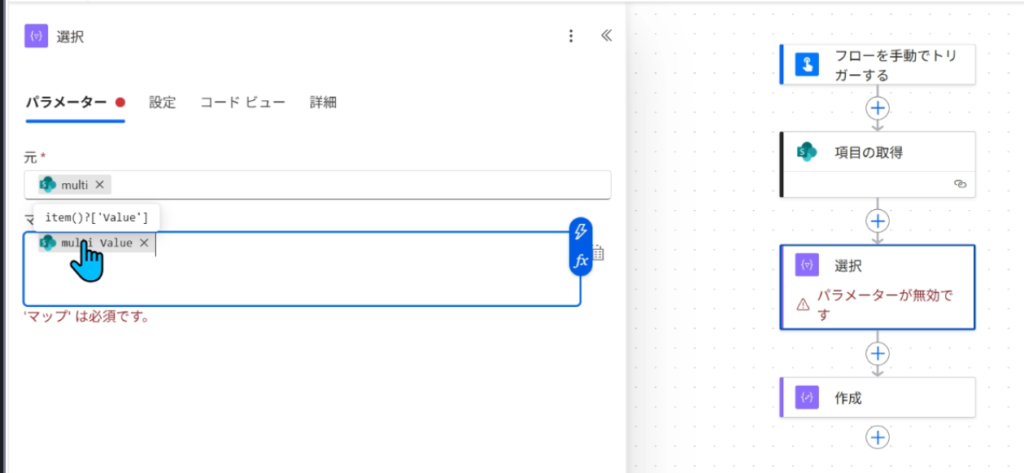 ただし、ここで気をつけたいのは、複数選択肢列の値はそのままでは扱いにくい形式になっているという点です。そのまま次のアクションに渡しても、思ったような結果にはなりません。