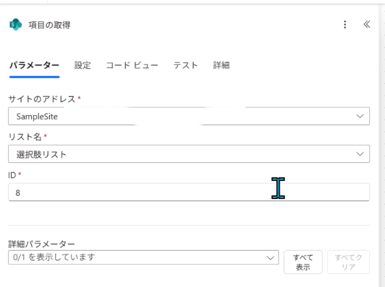 まず、項目の取得アクションを使って、SharePointリストから対象のアイテムを取得します。